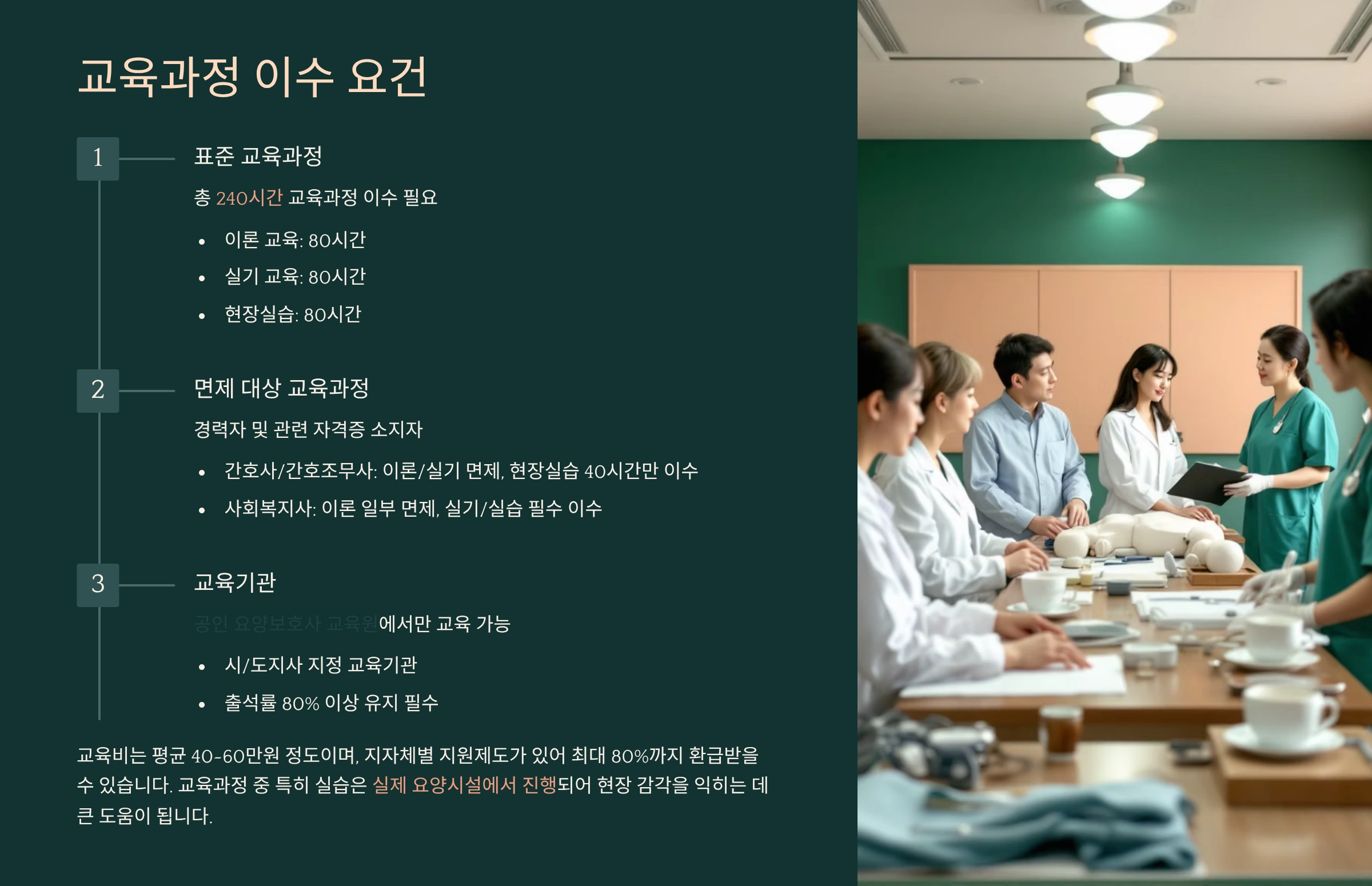 | 실습 | 80시간 | 요양원·재가요양센터 현장 경험 | 출석·평가 필수 |