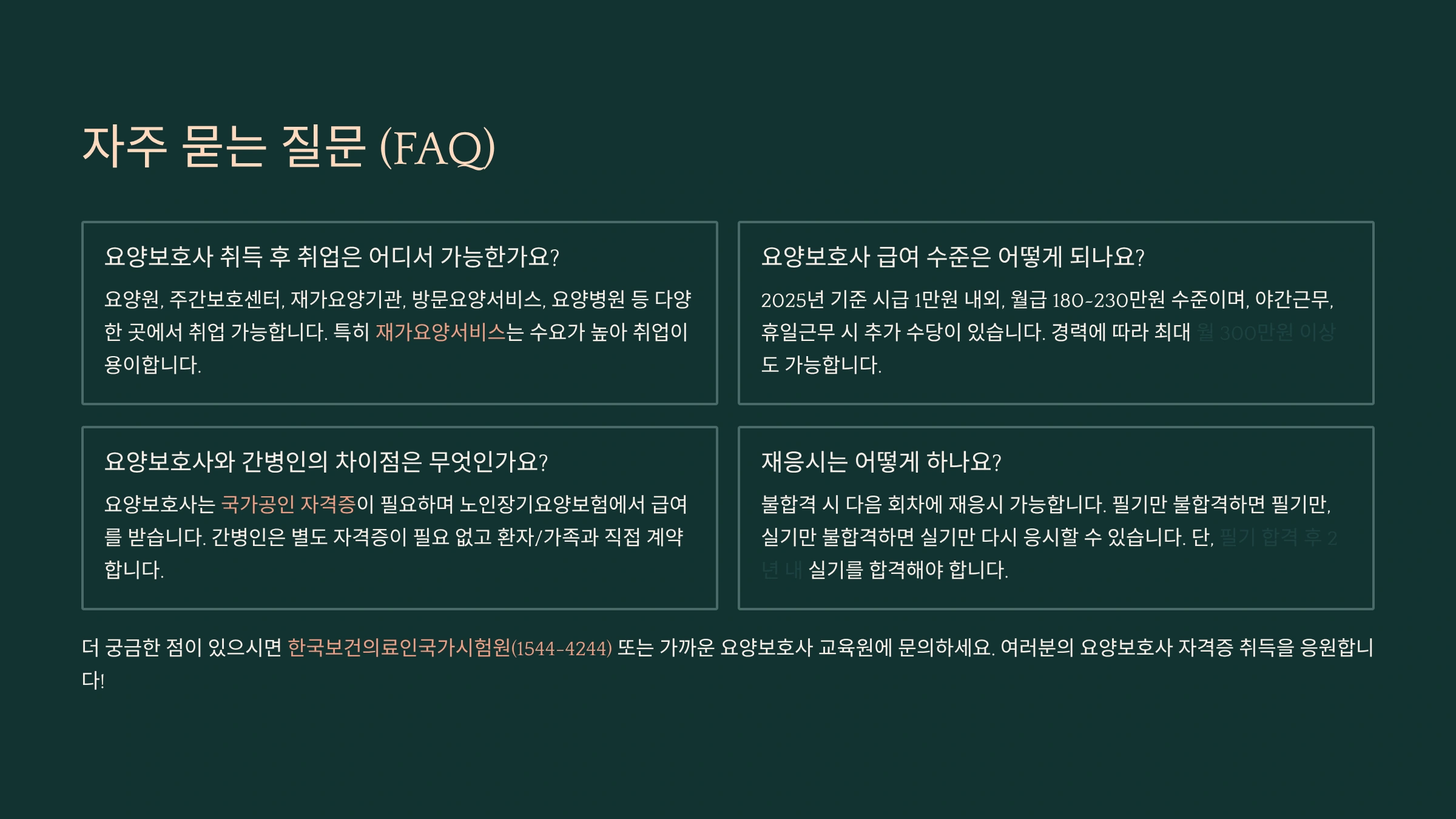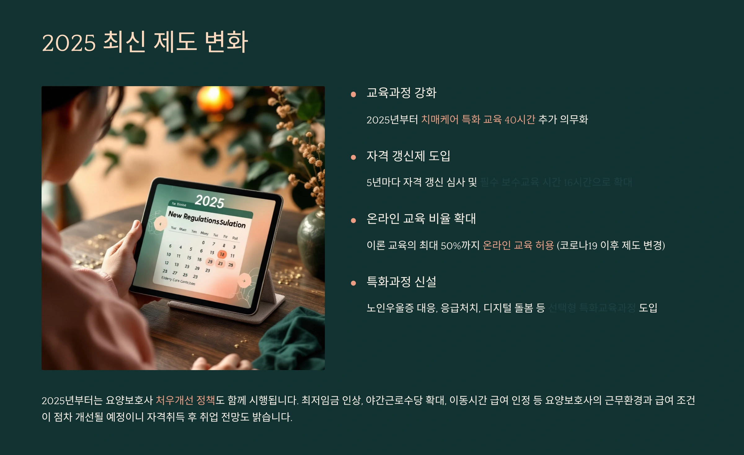 즉, 2025년 제도 변화는 요양보호사를 단순한 돌봄 인력이 아닌 전문 돌봄 전문가로 육성하려는 방향이에요. 이 흐름을 잘 따라가면 자격증 취득 후 더 안정적인 취업과 전문성을 확보할 수 있답니다. 🌟