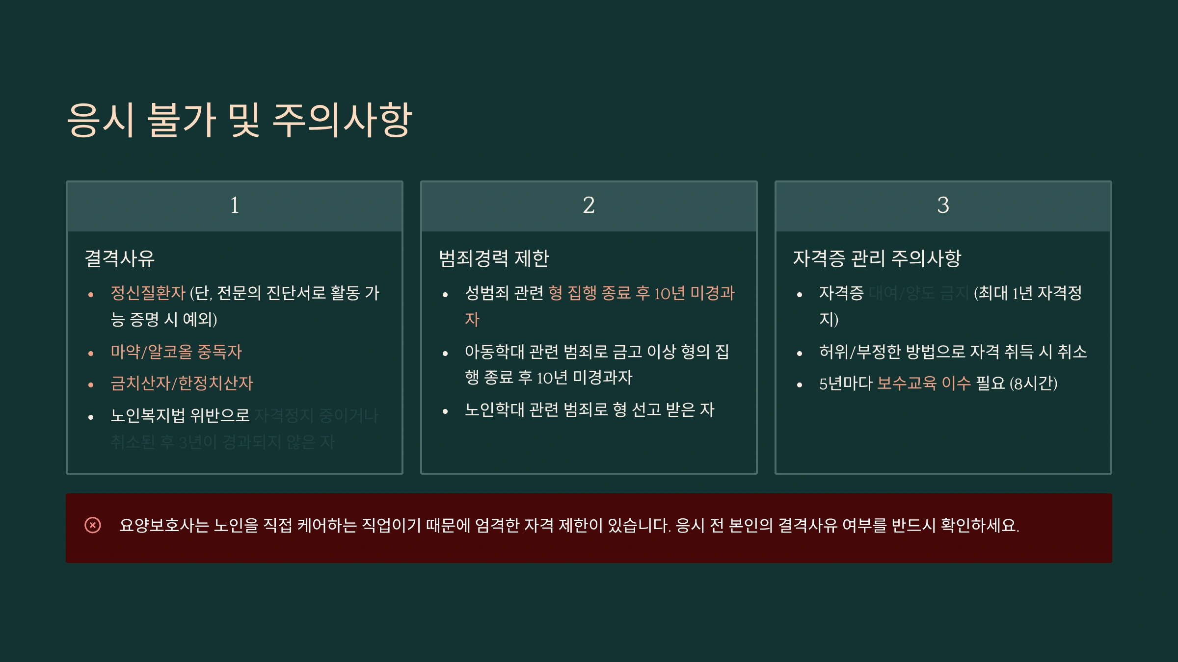 요양보호사 자격증은 나이·학력 제한이 없는 개방적인 시험이지만, 몇 가지 경우에는 응시가 불가능하거나 주의가 필요해요. 이는 어르신 돌봄 서비스의 특성상 안전과 윤리를 최우선으로 고려하기 때문이에요.
