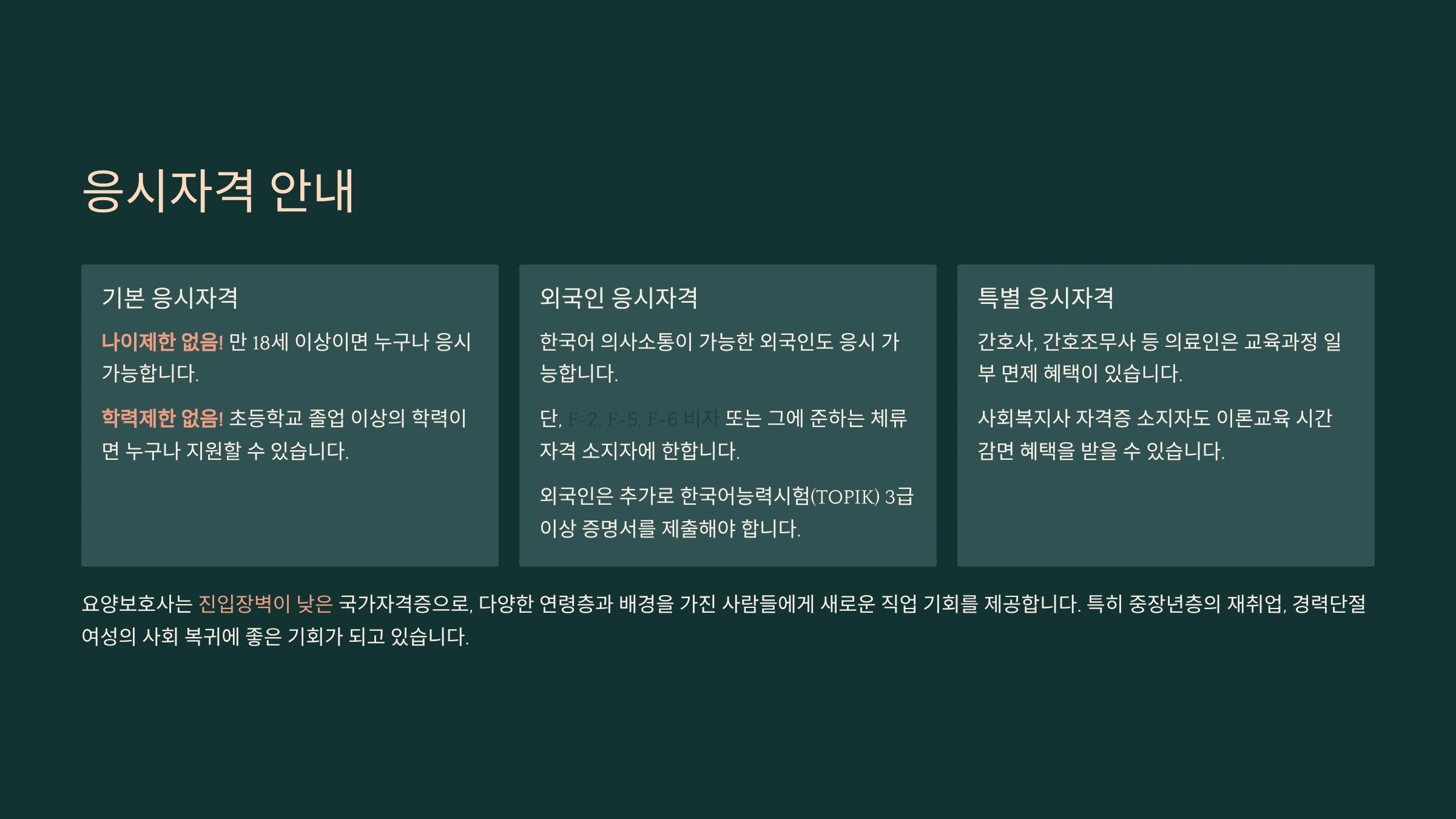 요양보호사 자격증은 다른 국가자격증과 달리 나이와 학력 제한이 전혀 없어요. 18세 이상 성인이면 누구나 교육과정을 이수한 뒤 시험에 응시할 수 있어요. 이는 고령화 사회에서 요양 인력이 부족한 현실을 반영해 만든 제도적 특징이에요.