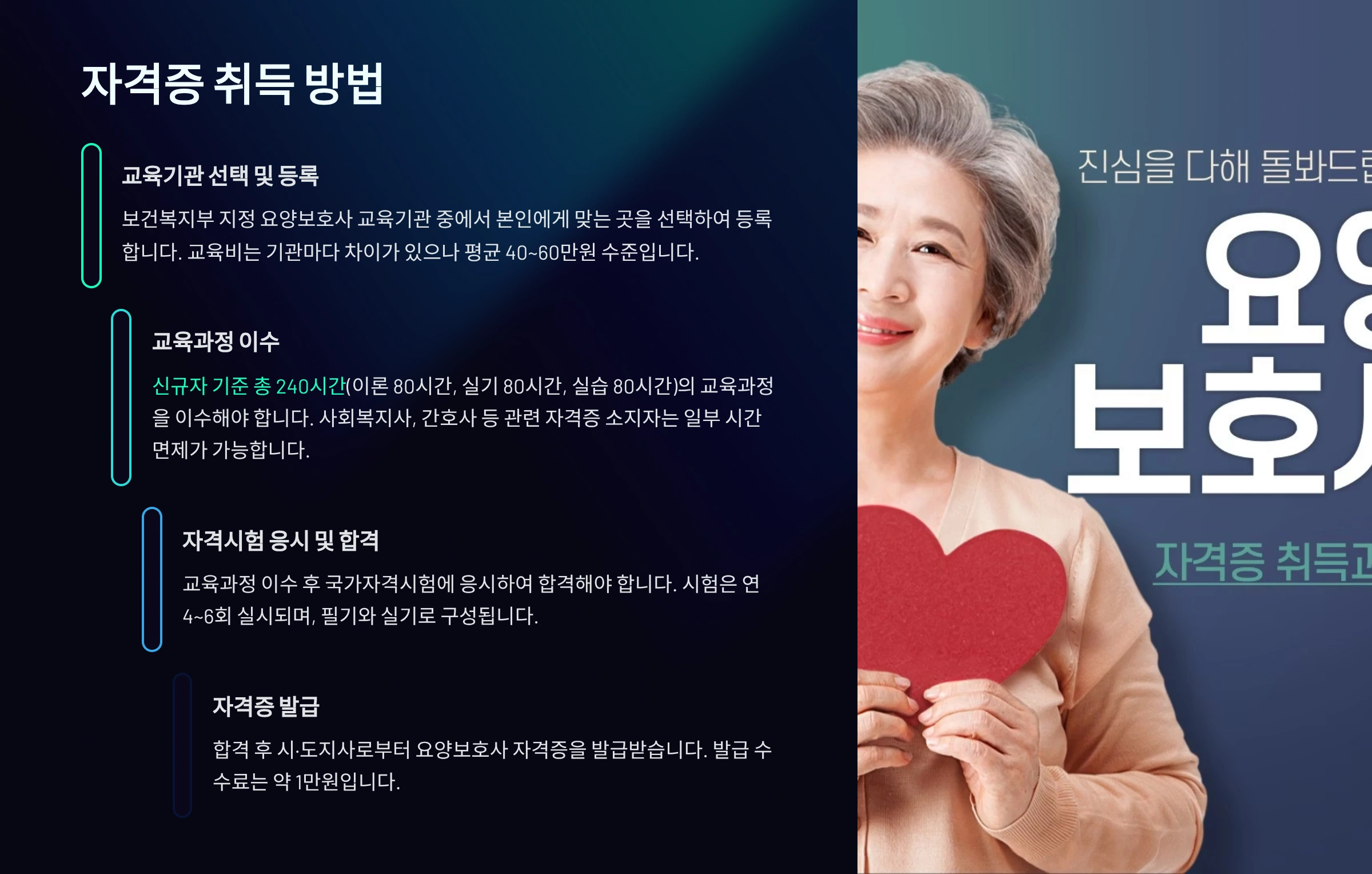 정리하면, 교육원 등록 → 240시간 이수 → 국가시험 합격 → 자격증 발급 → 취업 또는 창업으로 이어지는 단계예요. 제도가 정해져 있어서 길이 명확하고, 노력한 만큼 안정적인 취업 기회를 잡을 수 있는 자격증이랍니다.