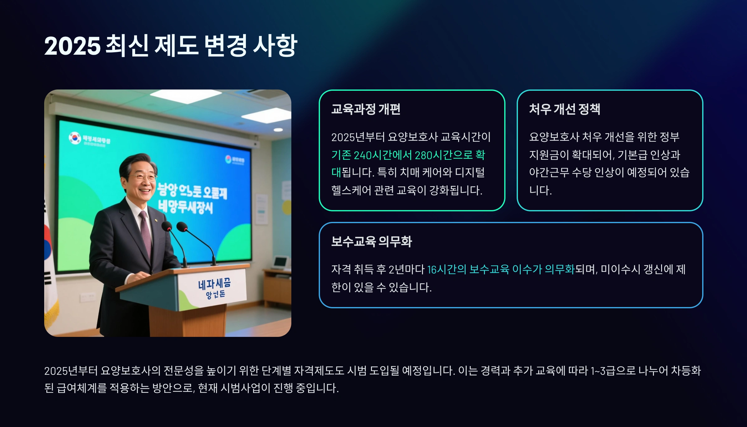 특히 2025년부터는 교육 이수 과정의 온라인 학습 비중이 확대됐고, 치매전문 교육과정이 강화되는 등 제도 개편이 있었어요. 내가 생각했을 때 이는 현장의 전문성을 강화하고, 돌봄 서비스 질을 높이는 긍정적인 변화라고 보여요.