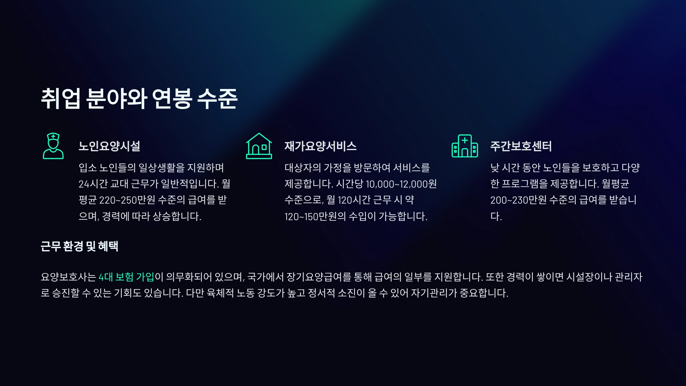 | 5. 취업 | 요양원, 재가센터, 병원 등 | 현장 수요 꾸준 |