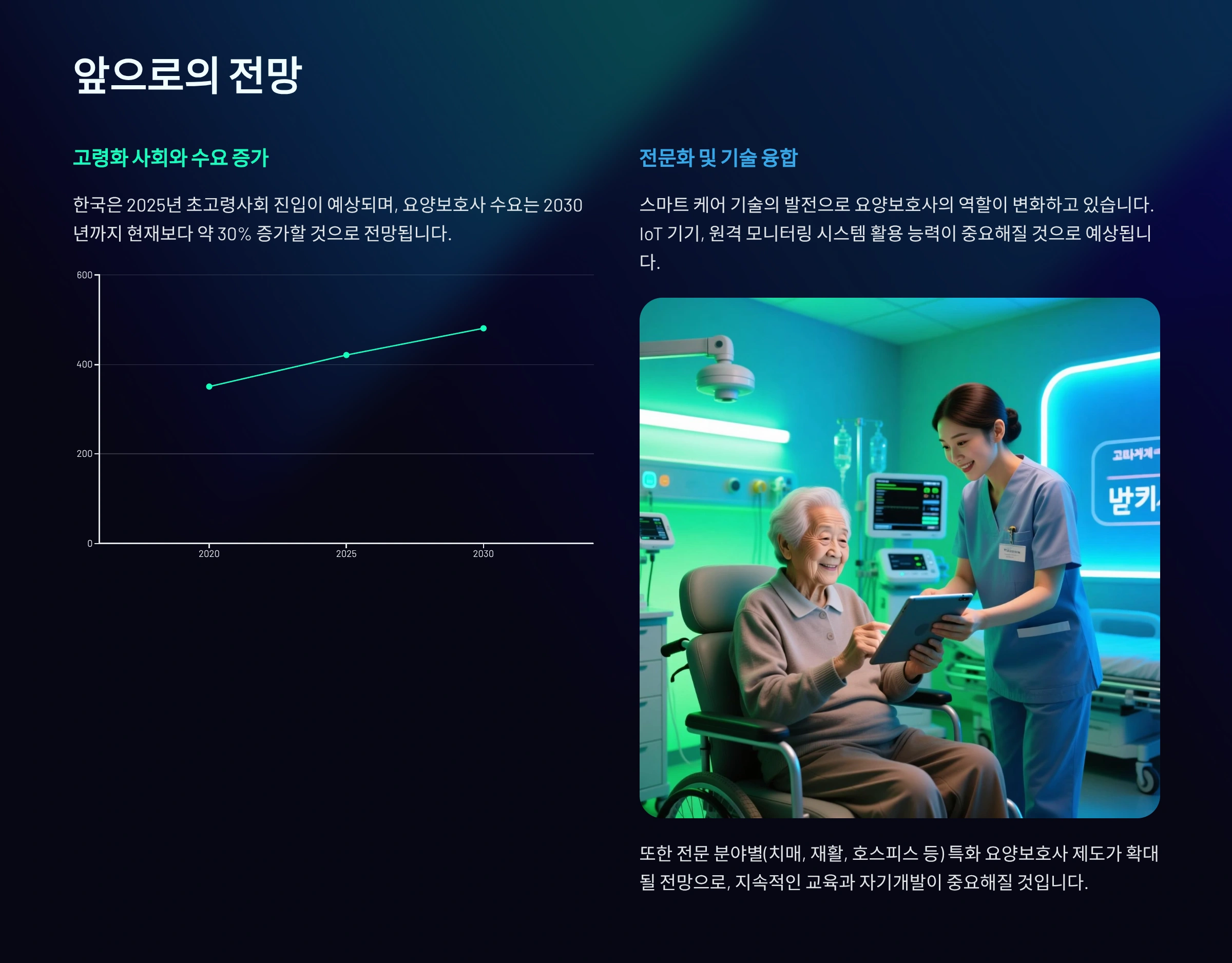 특히 치매 환자와 거동 불편 어르신 증가로 인해 전문 요양 서비스의 필요성이 높아지고 있어요. 단순히 돌봄을 넘어, 심리·인지 지원, 재활 보조까지 요구되기 때문에 요양보호사의 역할이 점점 더 전문화될 전망이에요. 단순한 돌봄 인력이 아닌 '케어 전문가'로 자리매김할 가능성이 커요.