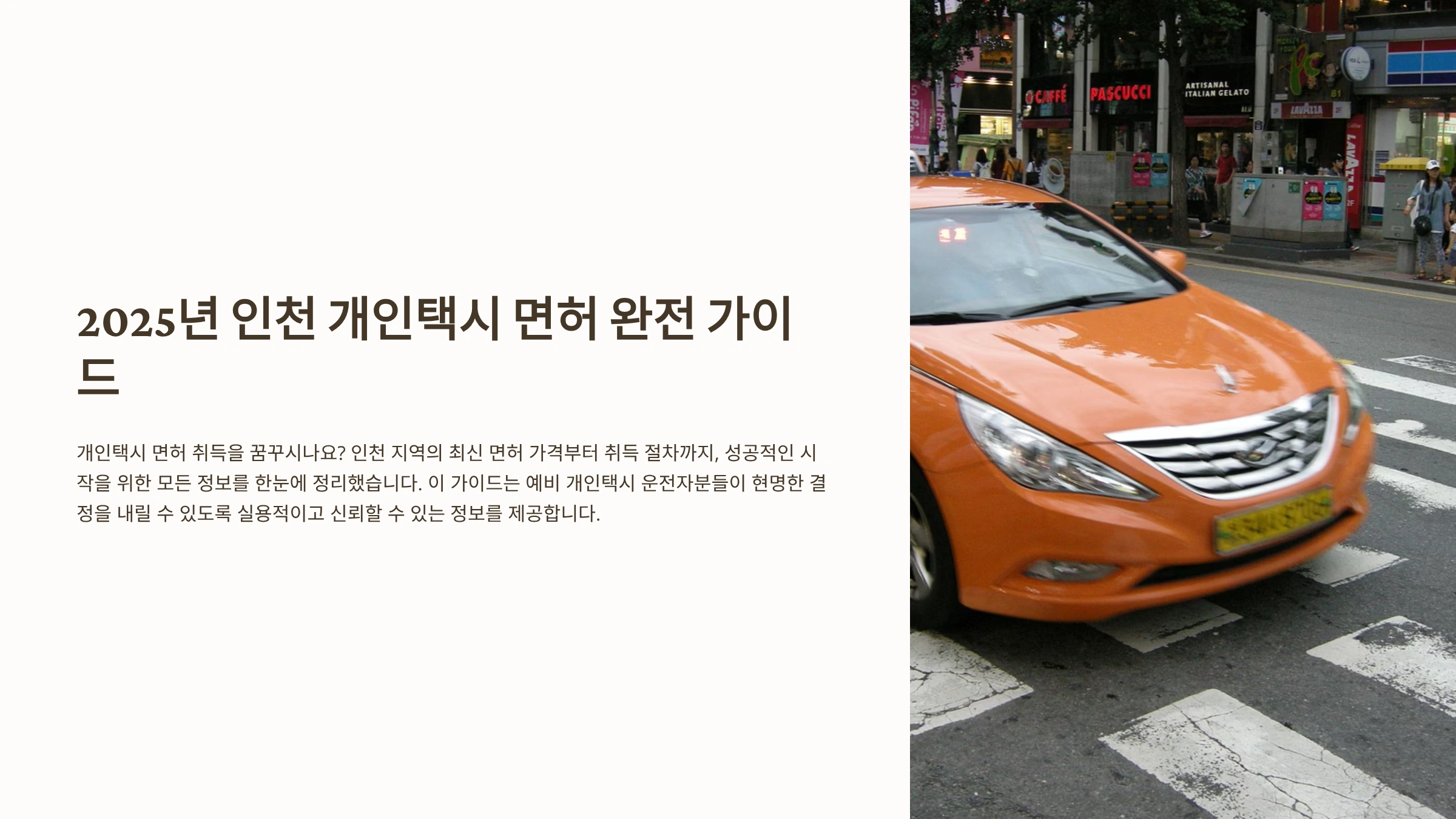 - ✅ 안정적인 수요: 인천은 공항, 항만, 신도시 등 꾸준한 택시 수요가 있습니다.