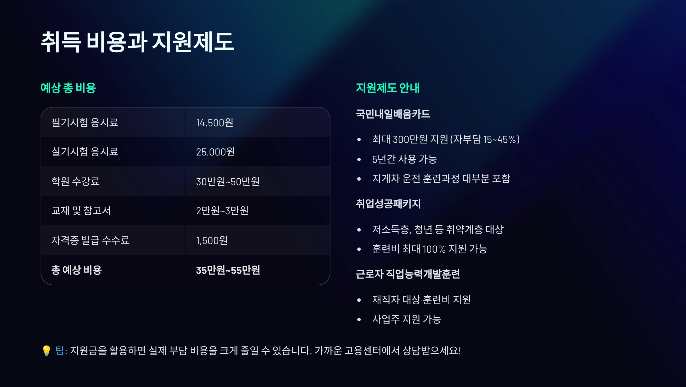 지역·기관·장비 수준에 따라 편차가 있고, 전동·리치형 실습을 별도로 제공하는 곳은 비용이 늘 수 있어요. 국비훈련을 활용하면 자비 부담이 눈에 띄게 낮아져요.