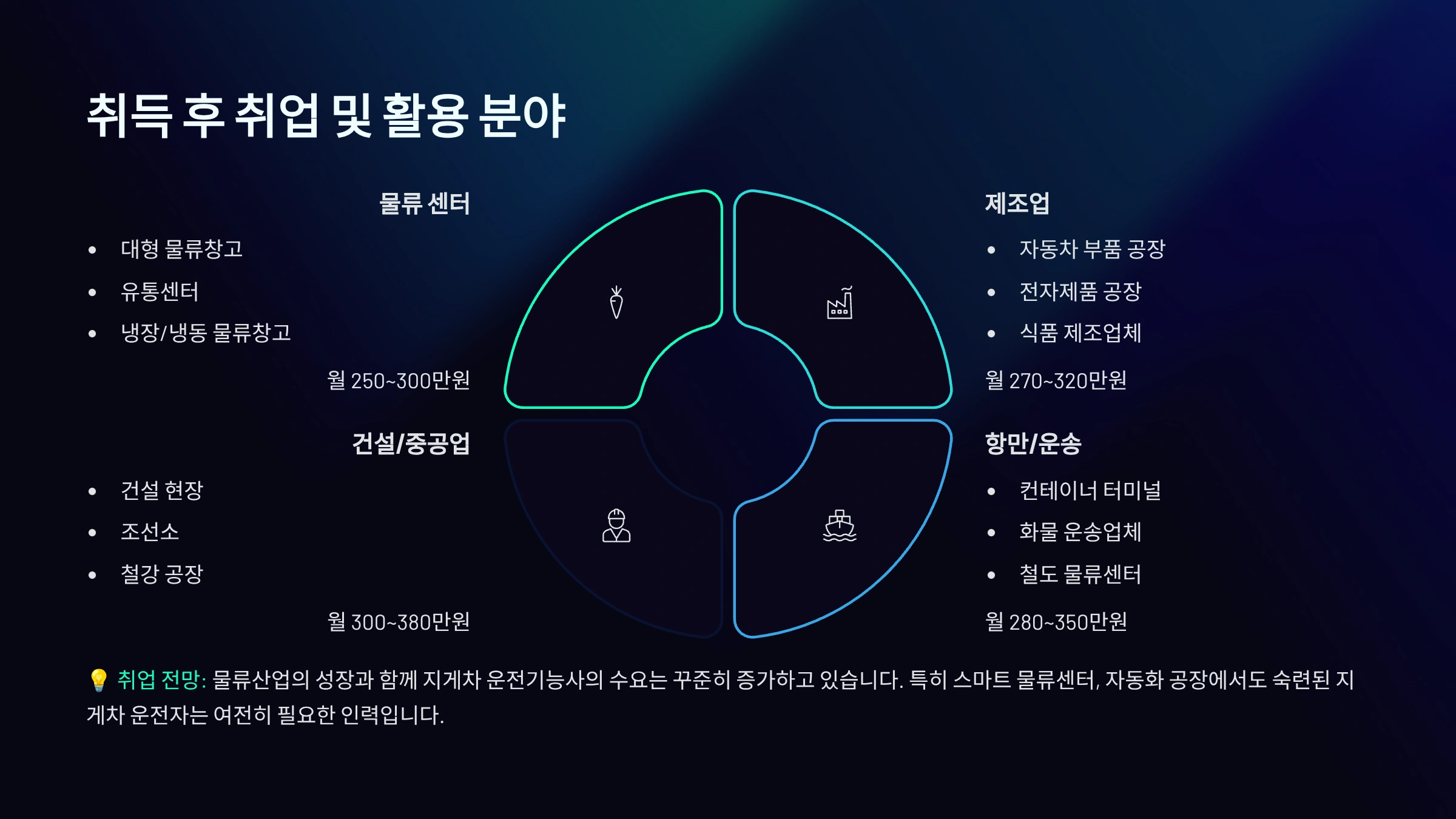 활용 분야는 물류센터, 항만·터미널, 제조원료 창고, 건설자재 야적장, 철강·목재·화학 등 다양해요. 자격증이 있으면 단순 상하차를 넘어 재고 이동 전략, WMS(창고관리시스템) 연동, 피킹 동선 최적화 같은 업무로 폭을 넓힐 수 있어요. 현장 안전 리더 역할도 자연스럽게 맡게 되죠.