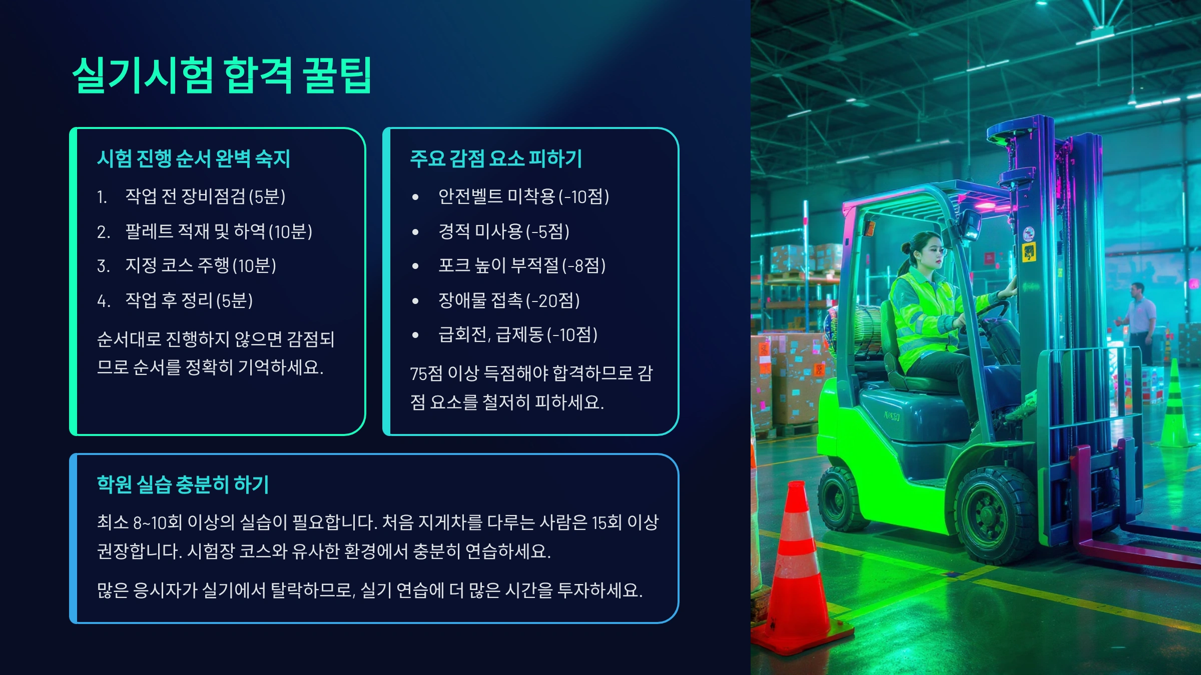 실기는 라인·각·속도의 삼각형을 맞추는 게임 같아요. 콘 기준 회전점, 마스트 수직 복귀, 포크 10~15cm 띄우기, 팔레트 삽입 후 미세 틸트, 퇴로 확인 후 출발 같은 루틴을 체크리스트로 만들어 반복하면 몸이 먼저 반응해요. 경적은 회전 시작 전, 교차 구간, 시야 차단 구간에서 확실히 눌러요.