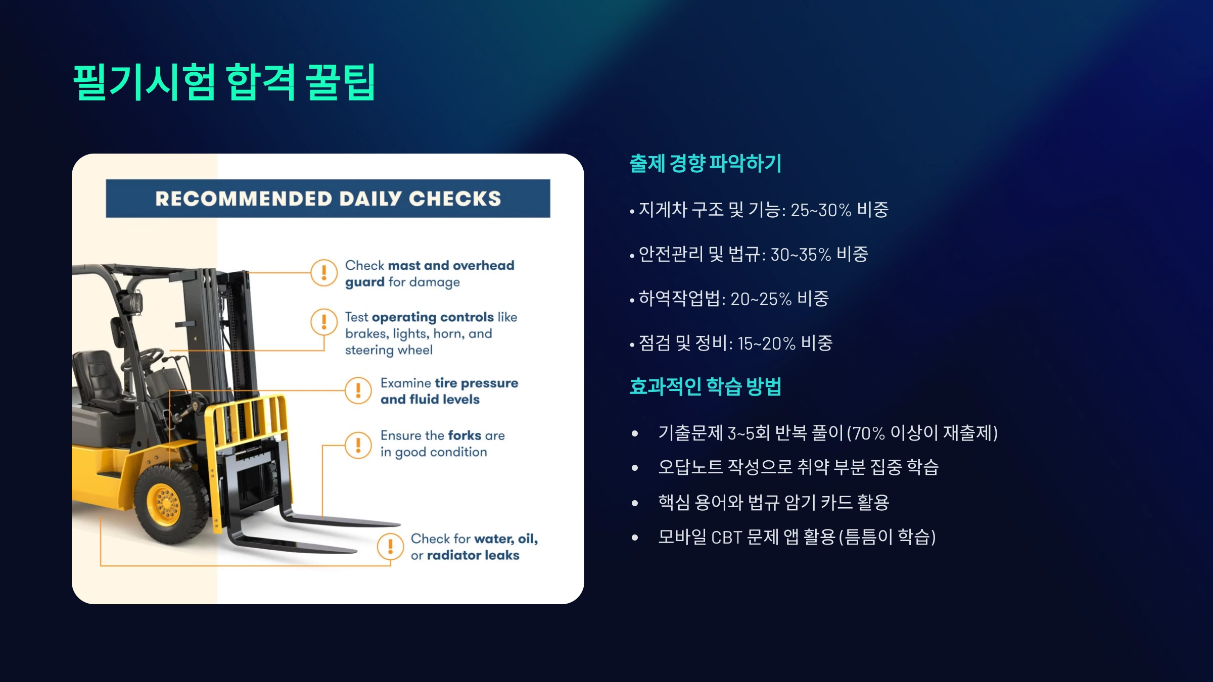 필기는 산업안전, 지게차 구조, 유압·전기 기초, 하중중심, 작업표준이 주로 나와요. 계산 문제는 정격하중, 중심거리, 경사도, 통로 폭 산정 등이 출제돼서 공식·단위 변환 연습이 좋아요. 실기는 S·ㄷ자 코스 주행, 팔레트 적재·하역, 정지선 정밀 정차, 포크 높이 조정, 휘파람 금지·경적 사용 같은 수칙을 실연해요.