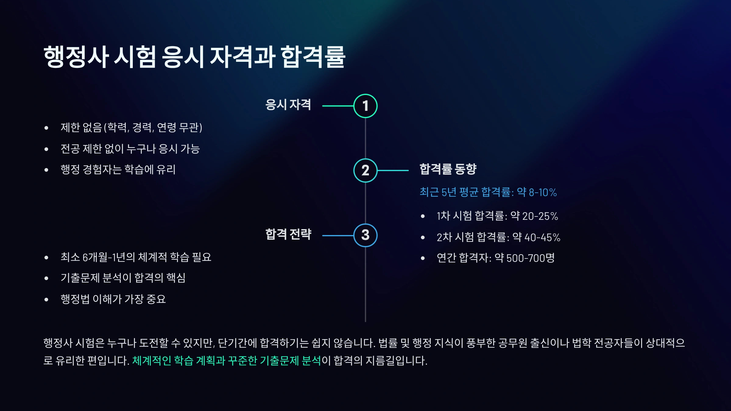 이 표를 보면 시험 난이도가 매년 유지되면서도 응시자가 꾸준히 늘고 있음을 알 수 있어요. 이는 행정사가 미래 전망이 밝은 직업이라는 것을 보여주는 지표이기도 해요. ✨