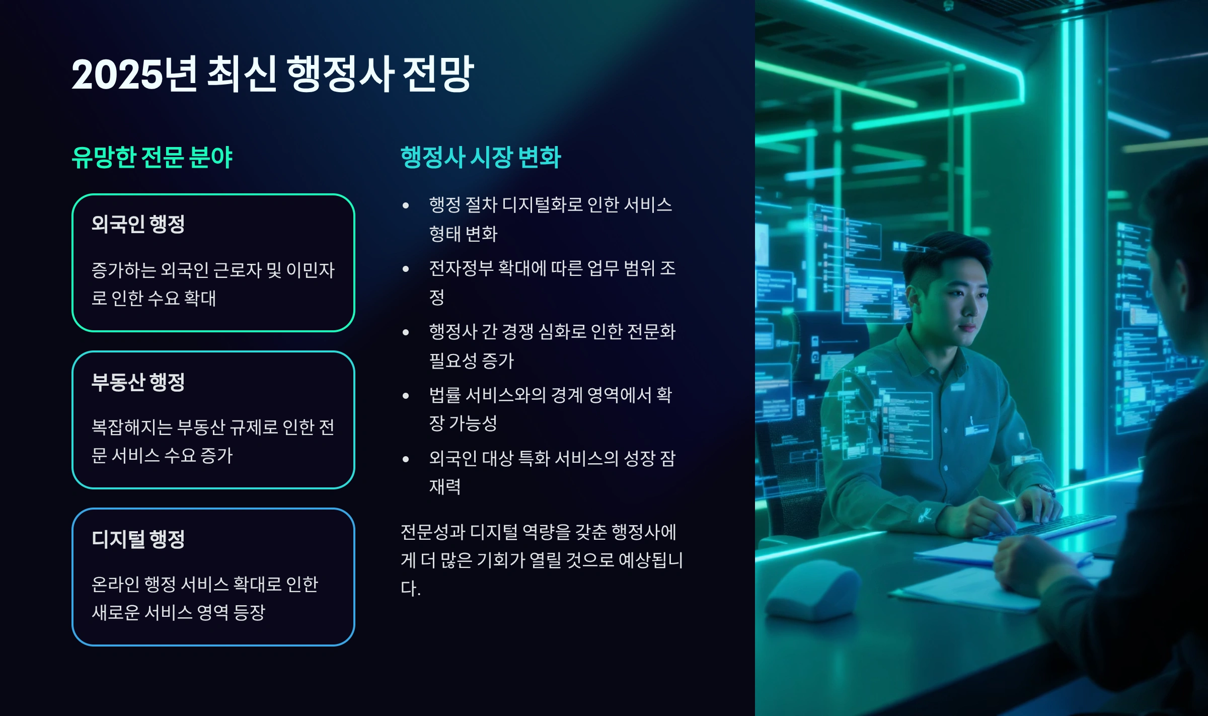 2025년 행정사 시장의 큰 흐름은 디지털 행정 전환, 이민·체류 수요 증가, 지역 맞춤형 규제 대응, 그리고 플랫폼 기반 고객 유입의 고도화예요. 전자문서·온라인 접수가 확대될수록 제출 형식·요건 오류가 늘어나고, 심사 기준은 더 촘촘해지기 때문에 숙련된 대리인의 가치가 커지고 있어요.