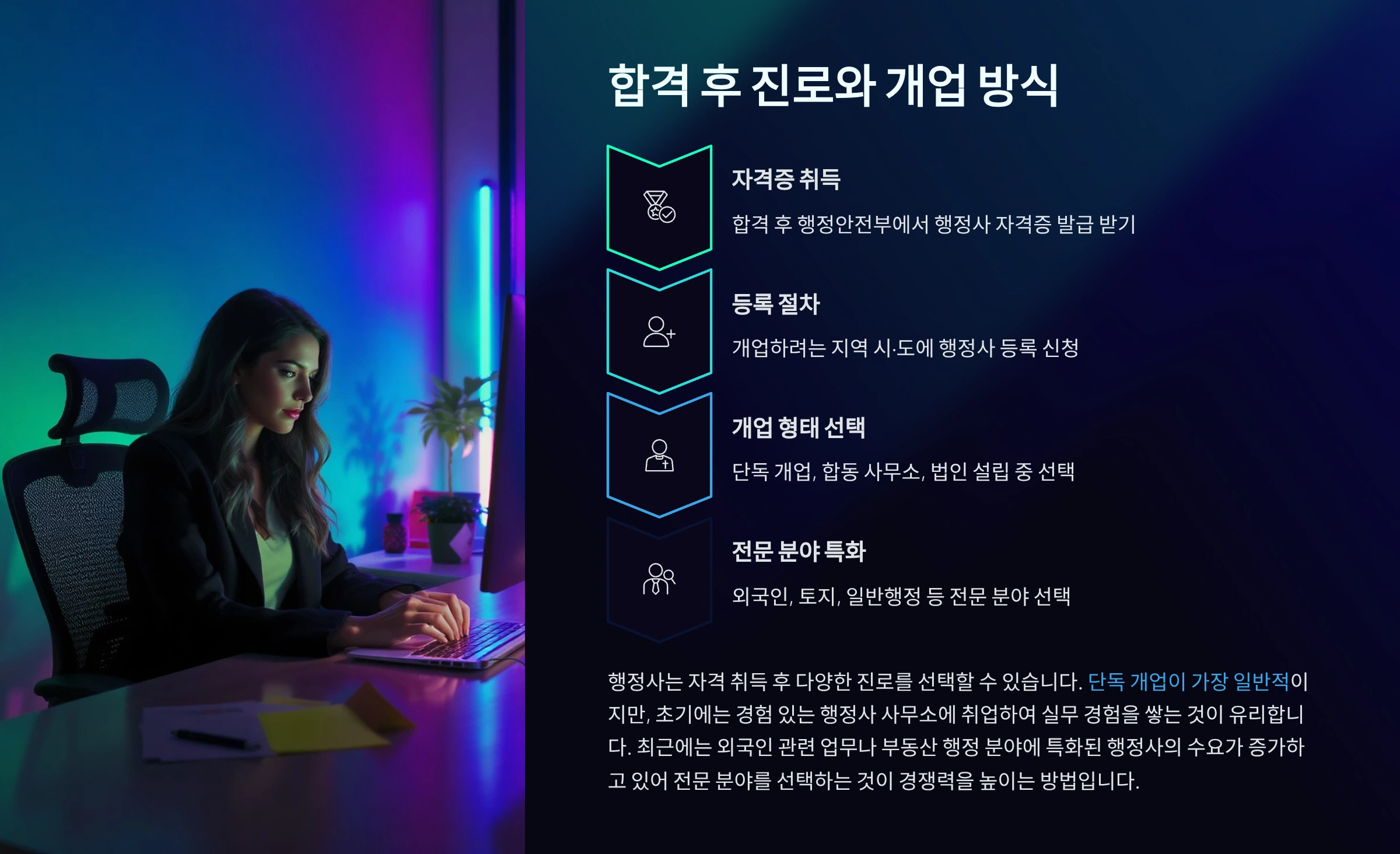 첫째, 개인 사무소를 열어 개업하는 방식이고, 둘째, 기존 행정사무소나 로펌·세무회계법인과 같은 전문가 조직에 소속으로 들어가는 방식이며, 셋째, 기업의 인허가·규제 대응 파트로 취업하는 길이에요. 각 선택지는 초기 비용, 리스크, 수익 구조가 달라서 본인 상황과 성향을 정확히 점검하는 게 좋아요.