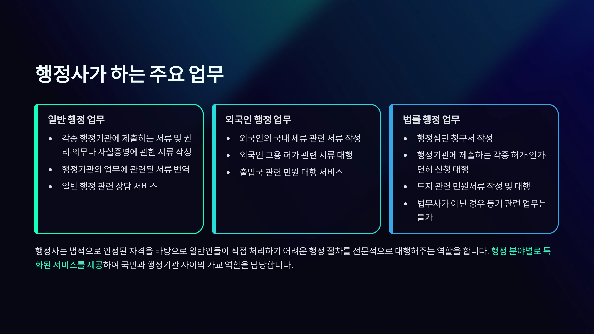 행정사는 공무원 퇴직자뿐만 아니라 일반인도 도전할 수 있는 국가전문자격사예요. 법률과 행정 실무를 기반으로 민원 대리, 인허가 업무, 계약 및 서류 작성 등을 수행하면서 전문성과 안정성을 동시에 갖춘 직업으로 주목받고 있어요.
