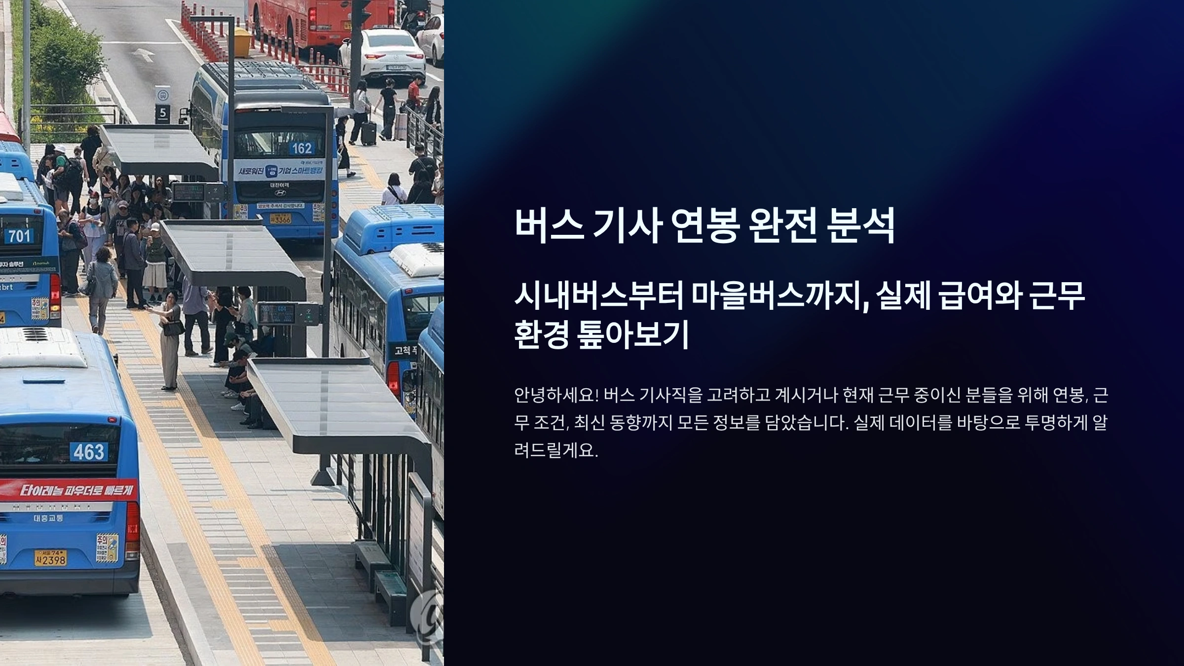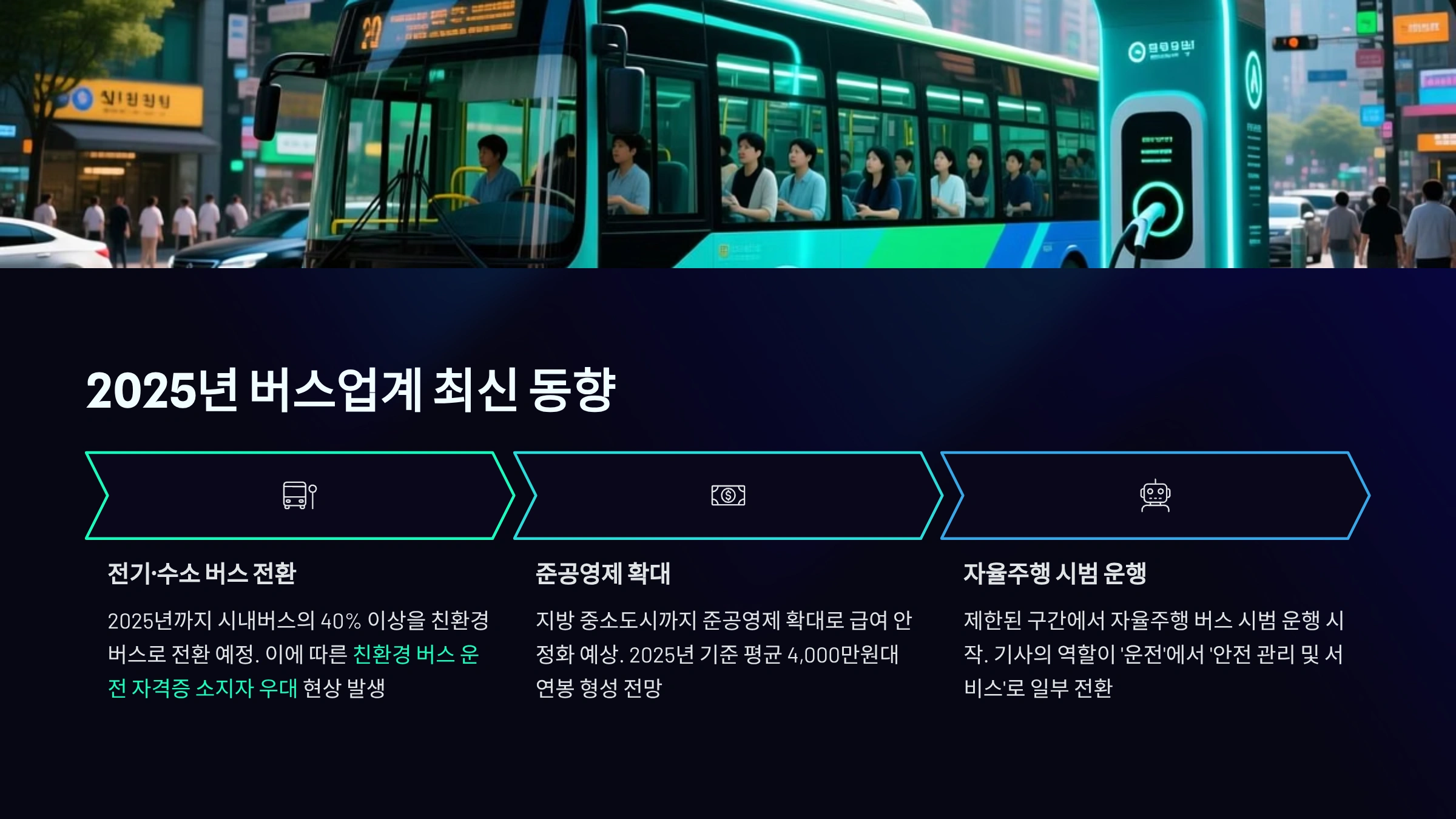 다음은 ‘2025년 버스업계 최신 동향’을 살펴볼 차례예요. 최근 인력난, 자동화 도입, 정책 지원 같은 변화가 기사 연봉에도 직접적인 영향을 주고 있거든요.