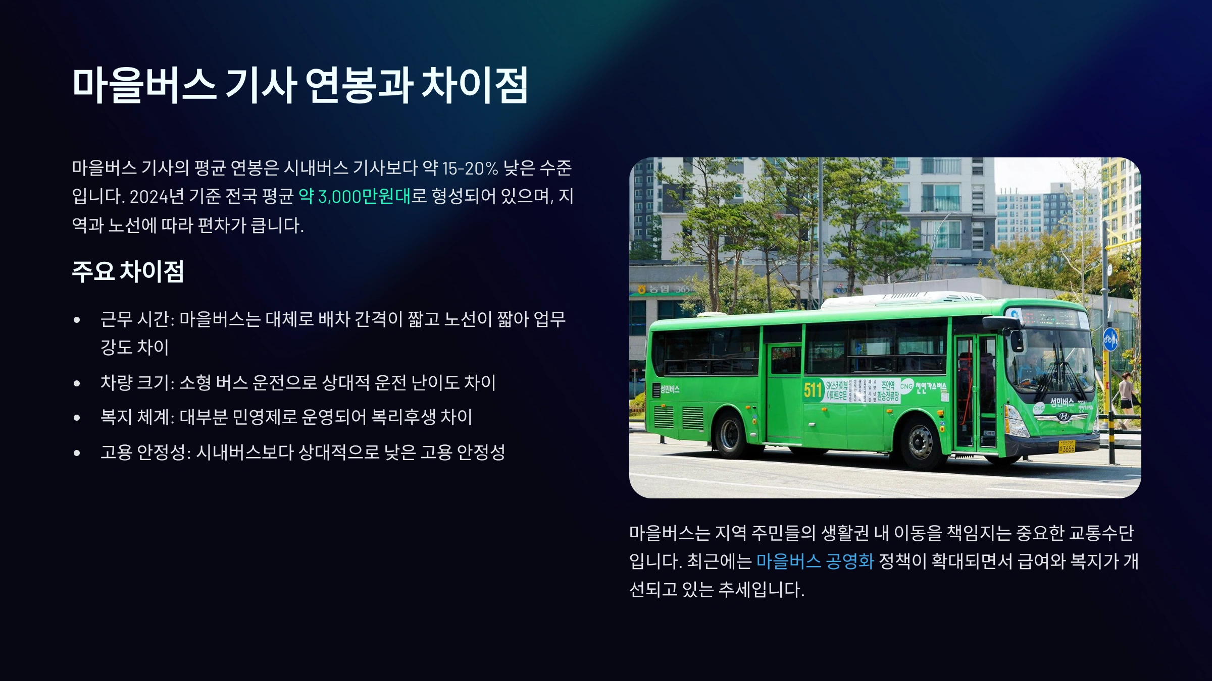 그러나 마을버스 기사의 장점도 있어요. 노선이 짧고 지역 내 운행 중심이라 장거리 운전 스트레스가 적고, 대체로 심야 운행이 없다는 점이에요. 또, 지역 주민들과 친밀한 관계를 형성할 수 있어 안정적인 직업 만족도를 느끼는 기사님들도 많아요. 즉, 연봉은 낮지만 근무 강도나 삶의 균형을 중시하는 사람들에게는 매력적인 선택지가 될 수 있답니다.