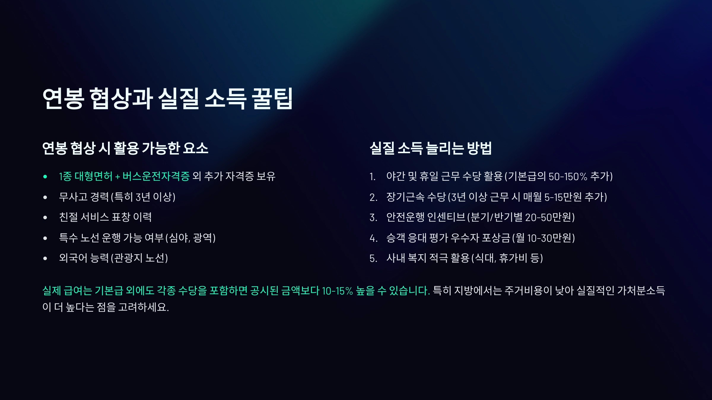 연봉 협상에서 가장 효과적인 방법은 근무 패턴 조율이에요. 예를 들어 주말·야간근무 비중이 높은 노선에 배치되면 수당이 크게 늘어나요. 일부 기사님들은 의도적으로 ‘야간+주말 근무’가 많은 노선을 택해 1년에 6000만원 이상을 벌기도 해요. 반대로 워라밸을 중시한다면 낮 근무 위주 노선을 요청해 안정적인 생활을 선택할 수 있죠.