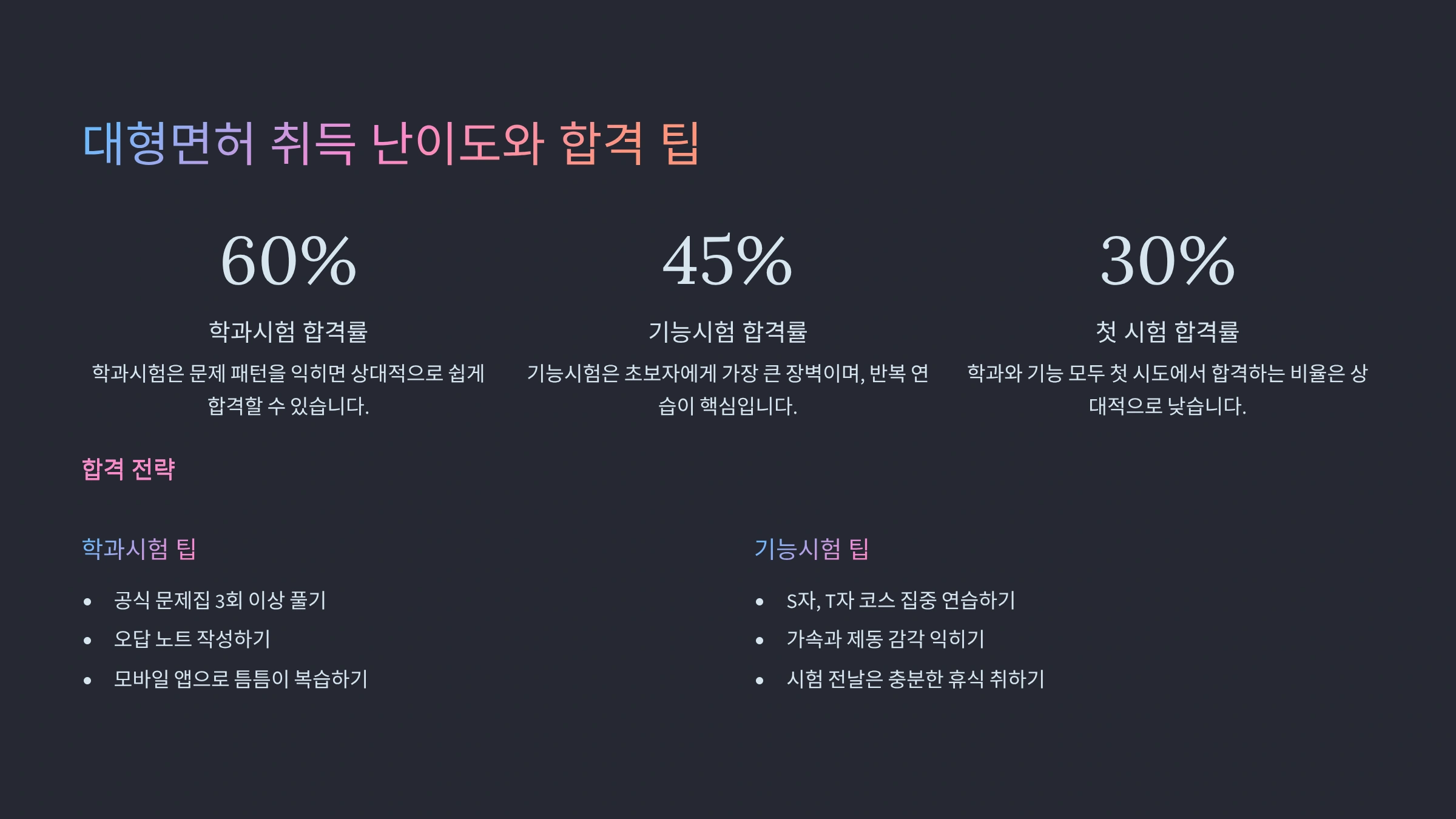 2025년 기준 대형면허 합격률은 기능시험 약 60%, 도로주행은 50% 안팎으로 보고돼요. 즉, 두 명 중 한 명은 한 번에 합격하지 못한다는 의미예요. 그렇기 때문에 충분한 연습과 전략적인 준비가 꼭 필요해요.