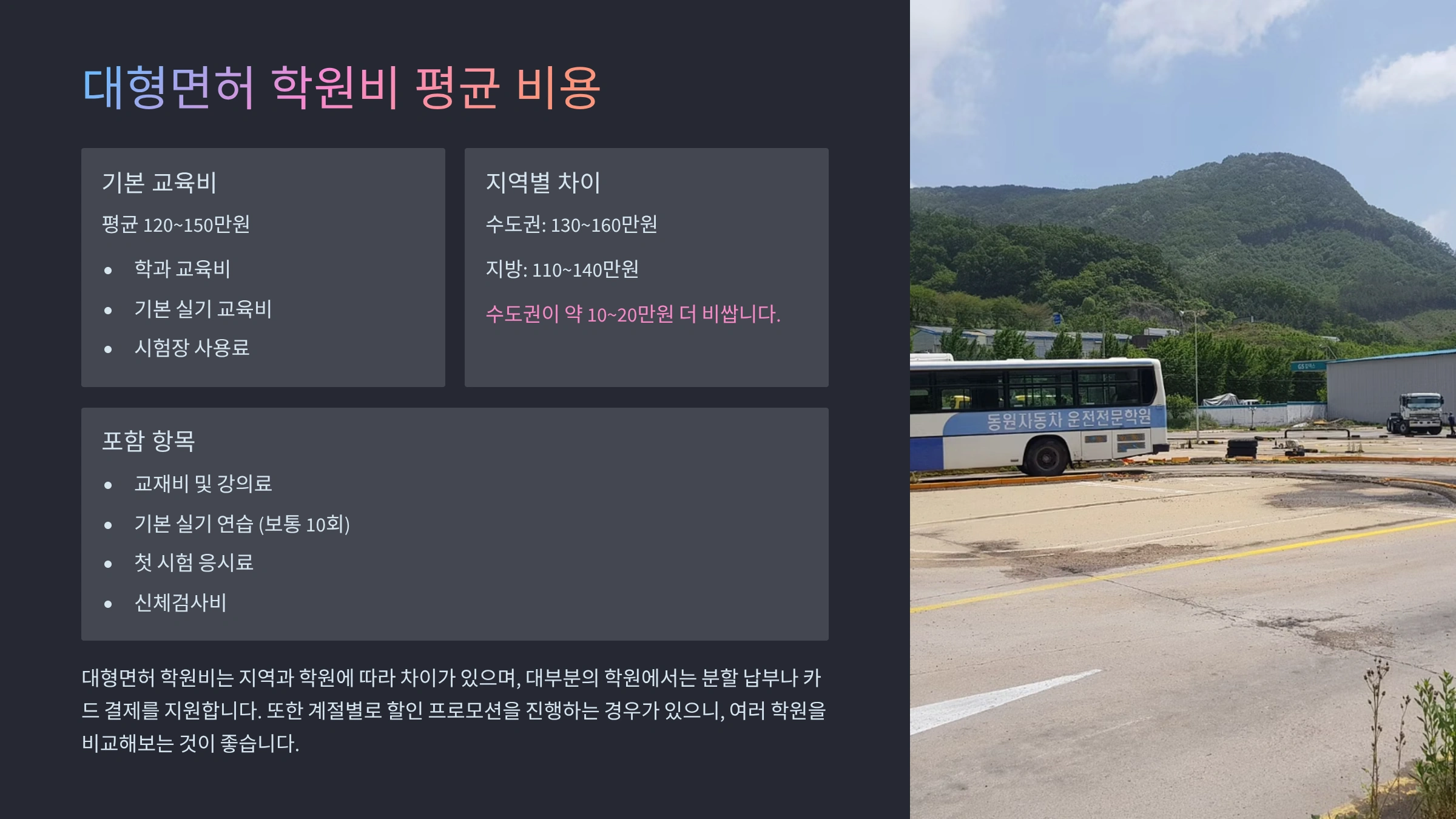 대형면허 학원비에는 보통 시험 응시료는 포함되지 않는 경우가 많아요. 즉, 학원 등록비 외에 시험 응시료(약 3~4만 원)와 재응시 시 추가 비용이 별도로 들어간다는 점을 고려해야 해요.